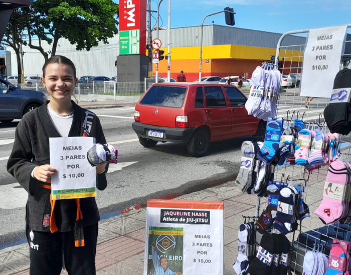 Para custear viagens e inscrições em torneios, Jaque dedica parte dos finais de semana à venda de meias na Avenida Presidente Kennedy, no Kobrasol. O apelido carinhoso de “menina das meias” reflete essa rotina intensa e ajuda a divulgar seu Instagram e fortalecer sua presença nas redes sociais para futuros patrocínios.