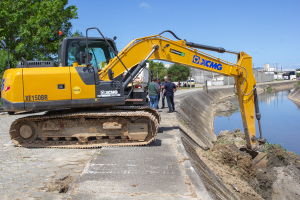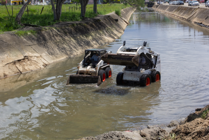 Paralelamente ao desassoreamento, outra equipe atua na roçagem e capina da vegetação nas margens do valo de escoamento do rio, contribuindo para ampliar a vazão e facilitar o escoamento das águas. Para a execução dos trabalhos, estão sendo utilizadas duas máquinas Bobcat e uma escavadeira hidráulica.