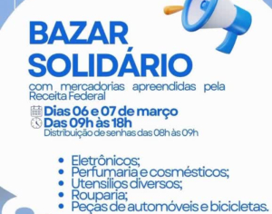 Ilustração Teve início na manhã desta sexta-feira (6), em São José, o Bazar Solidário com mercadorias apreendidas pela Receita Federal. O evento acontece no Orionópolis Catarinense, rua Frederico Afonso, no bairro Ponta de Baixo, e segue também no sábado (7), das 9h às 18h, reunindo centenas de produtos que costumam atrair grande público em busca de preços mais baixos.
