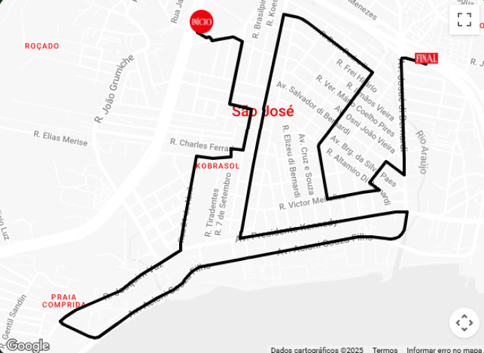 O trajeto em São José começa na Rua Cassol, próximo ao supermercado Fort Atacadista, no Kobrasol, seguindo pela Rua Caetano José Ferreira, José Firmino Novaes, Antônio Scherer, Charles Ferrari, 7 de Setembro, Maria Bernardina Vaz Borges, 21 de Abril, Joaquim Vaz, Constâncio Krumel, José da Costa Vaz, Avenida Acioni Souza Filho (Beira-Mar), Avenida Presidente Kennedy, Lédio João Martins (Avenida Central do Kobrasol) e Rua Dom Pedro II, encerrando em direção à via expressa.