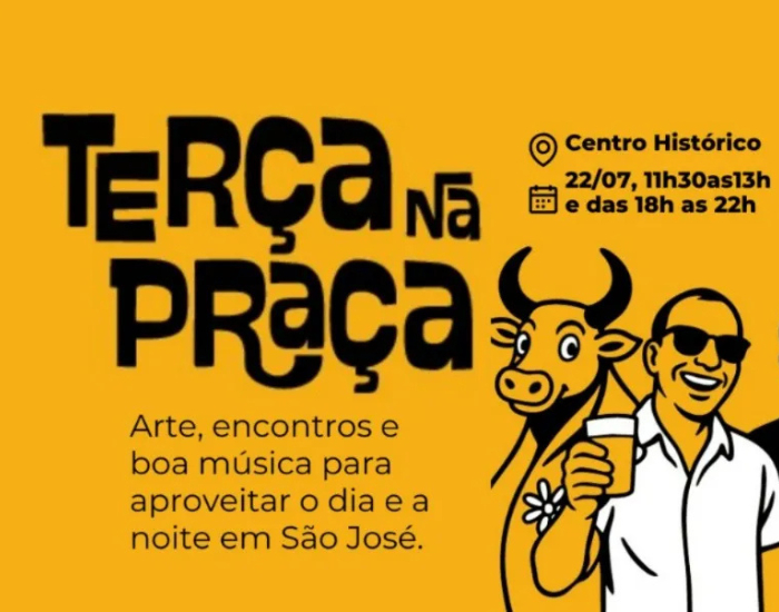 Divulgação A partir do dia 22 de julho, a Praça do Centro Histórico de São José passa a receber uma nova programação cultural: o projeto Terça na Praça, promovido pela Secretaria Municipal de Cultura e Turismo. A proposta é transformar o espaço em um polo de convivência e efervescência cultural, com shows, happy hour, comidas típicas e atrações para todas as idades de forma gratuita.