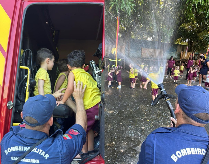 A visita terminou com o tradicional banho de mangueira, garantindo diversão e interação. A ação faz parte das iniciativas do CBMSC para aproximar a corporação da comunidade e incentivar a educação preventiva desde cedo.