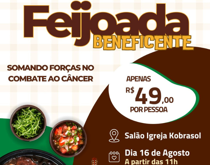 Divulgação Uma feijoada com sabor de solidariedade. Assim será o evento promovido pelo Instituto Bem Viver em parceria com o Mensageiros Voleibol Clube, no próximo dia 16 de agosto, a partir das 11h, no salão da Igreja do Kobrasol, em São José. O ingresso custa R$ 49,00 por pessoa e dá direito a uma deliciosa feijoada, música ao vivo com Duda Costa e, principalmente, a chance de contribuir com uma causa que transforma vidas.