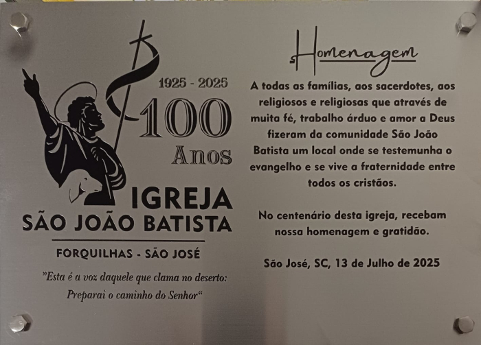 Divulgação A comunidade de Forquilhas, em São José, celebra neste mês os 100 anos da Igreja São João Batista, um dos marcos mais simbólicos da religiosidade e da história local. A missa festiva será realizada neste domingo (13), às 9h30, e marca o ponto alto das homenagens ao centenário da igreja que acompanha, há um século, o crescimento espiritual e comunitário da região.