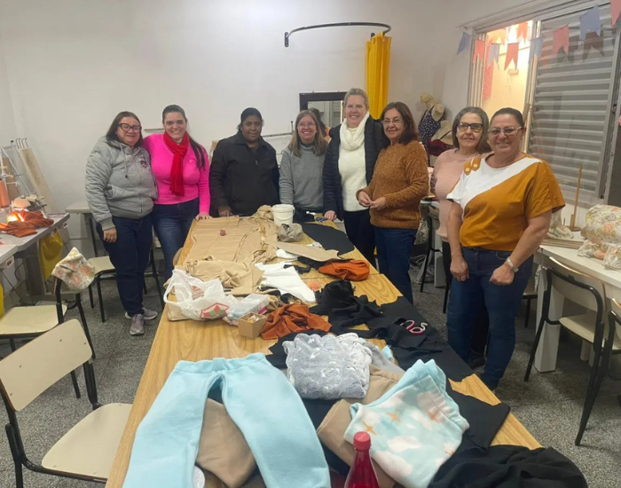 Divulgação O frio chegou, mas a solidariedade falou mais alto no bairro Forquilhinhas, em São José. Alunas da Escola Profissional Deolinda dos Santos Farias estão usando o que aprendem nas aulas de corte e costura para confeccionar calças de agasalho e doar a pessoas em situação de vulnerabilidade.
