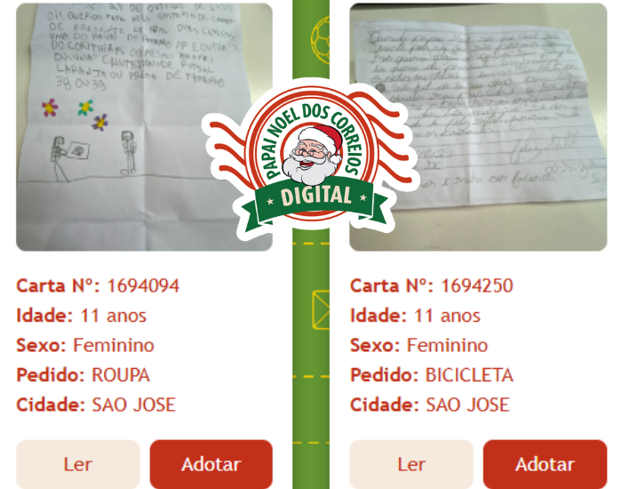SJ Agora/Divulgação A campanha Papai Noel dos Correios 2025 está em andamento e segue recebendo padrinhos até o dia 5 de dezembro. Em São José, mais de 160 cartinhas escritas por crianças do município estão disponíveis para adoção, aguardando voluntários dispostos a transformar o Natal de quem mais precisa.