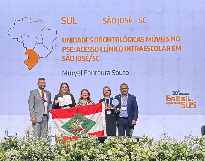 O segundo prêmio foi conquistado pelo projeto “Unidades Odontológicas Móveis no Programa Saúde na Escola (PSE): acesso clínico intraescolar em São José”, na categoria “Atenção Primária Forte: caminho para a saúde universal”. A ação leva serviços odontológicos diretamente às escolas, permitindo que alunos recebam atendimento durante o período letivo, sem necessidade de deslocamento às unidades de saúde.