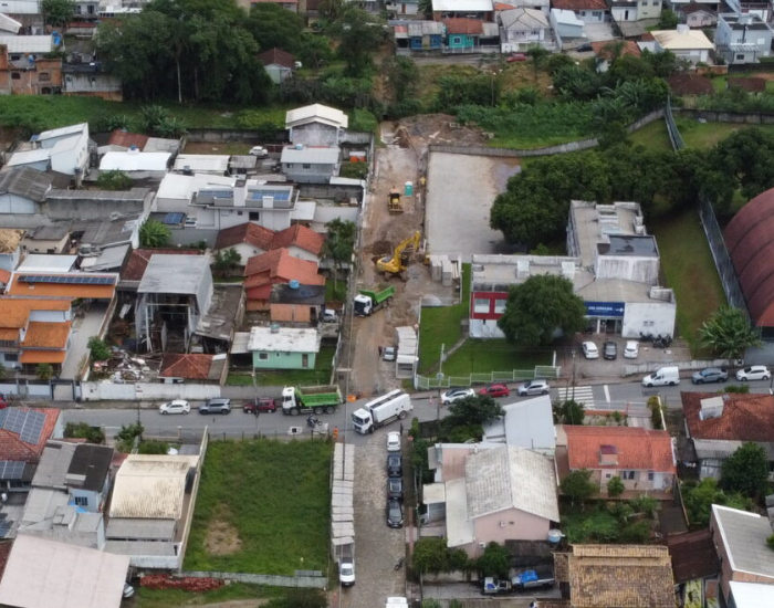 A intervenção integra uma obra maior executada na Rua José Francisco Vill, ao lado da Unidade Básica de Saúde (UBS) da Serraria. O projeto prevê a substituição da antiga galeria pluvial, de 1,20 x 1,20 metro, por estruturas maiores, de 2 x 2 metros, ao longo de 235 metros.