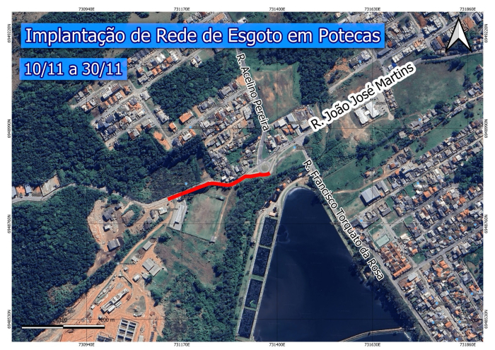 Os trabalhos vão ocorrer no trecho asfaltado da Rua João José Martins, no bairro Potecas, que terá o trânsito totalmente interditado entre 9h e 17h. O bloqueio vai do trecho da rotatória próxima à lagoa de estabilização da CASAN até a rua de acesso à nova ETE. O local estará devidamente sinalizado e contará com o apoio da Guarda Municipal, que orientará os motoristas sobre os desvios. Nos finais de semana, a via será liberada.