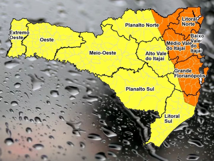 No fim desta sexta-feira (20), o risco é alto para alagamentos, enxurradas, destelhamentos e danos na rede elétrica, principalmente entre a Grande Florianópolis e o Litoral Norte. Apesar da chuva, as temperaturas sobem e os termômetros podem chegar aos 27°C a 30°C, mantendo a sensação de abafamento por conta da umidade elevada.