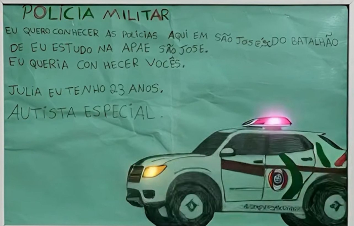SJ Agora/Reprodução Uma carta escrita com carinho foi o ponto de partida para um encontro que ficará marcado na memória. O 7º Batalhão da Polícia Militar de São José recebeu o pedido especial de Júlia, de 23 anos, aluna da APAE de São José, que sonhava em conhecer de perto o trabalho dos policiais militares.