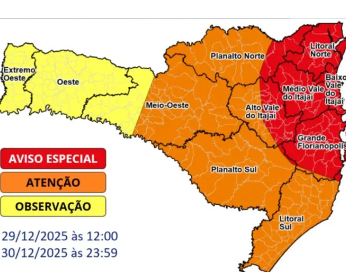 Divulgação/SJ Agora A Defesa Civil de Santa Catarina elevou o nível de alerta para temporais na Grande Florianópolis, passando de laranja para alerta vermelho nesta segunda-feira (29), indicando risco muito alto de chuva forte, ventos intensos e outros fenômenos adversos.