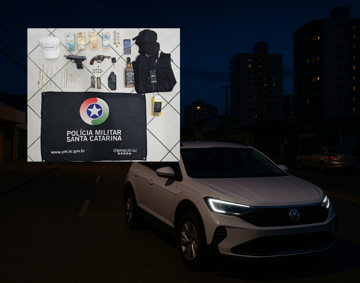 A guarnição aguardou o retorno do suspeito ao veículo e, na sequência, realizou a abordagem. Durante a busca veicular, os policiais encontraram uma pistola carregada e municiada, um revólver com uma munição, um carregador sobressalente com 11 munições, roupas e bonés diversos, pingentes, anéis, correntes douradas, uma garrafa de whisky e um celular. Também foram apreendidos R$ 36.339,65 em dinheiro vivo.