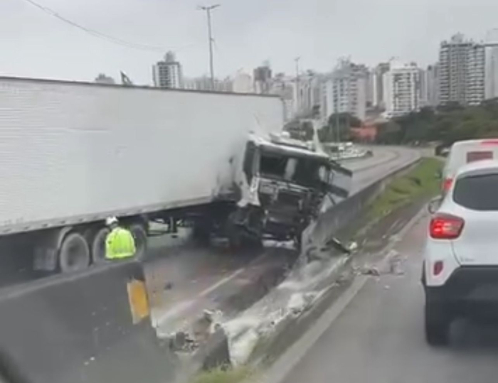 Reprodução/SJ Agora Uma carreta colidiu contra a mureta lateral no km 207,1 da BR-101, em São José, sentido Curitiba, no fim da manhã desta sexta-feira (7). O motorista acabou se perdendo sozinho na direção e o veículo atingiu a mureta, sem envolver outros automóveis. Apesar do susto, ele não ficou ferido. A batida causou danos na estrutura lateral da rodovia e deixou o trânsito lento na região.