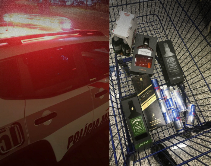 Carrinho cheio, estratégia discreta e grande quantidade de bebidas alcoólicas chamaram a atenção da segurança, que impediu a fuga até a chegada da polícia