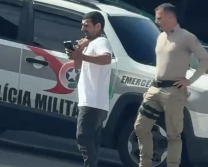 Reprodução/SJ Agora Momentos de tensão foram registrados em frente à Base da PM de Forquilhinhas nesta tarde de segunda-feira (2), quando policiais se depararam com um homem em surto, segurando uma faca e ameaçando tirar a própria vida.