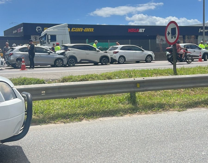 Ricardo Pastrana/SJ Agora Um engavetamento envolvendo cinco automóveis nesta manhã de quinta-feira (18) causa lentidão nesta na BR-101, em São José, no km 202,7, sentido Sul. O acidente ocorreu por volta das 10h06 e resultou na interdição da pista da esquerda e do acostamento, gerando fila de aproximadamente dois quilômetros.