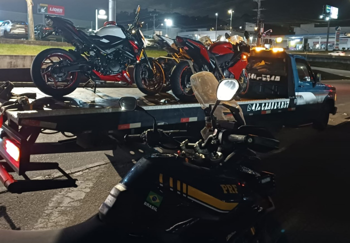 Divulgação Policiais rodoviários federais flagraram, na noite desta quinta-feira (21), cinco motocicletas esportivas equipadas com dispositivos ilegais para ocultar a placa de identificação. A fiscalização ocorreu na BR-101, nos trechos de São José e Palhoça.