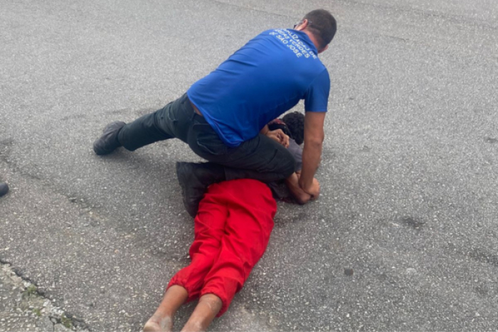 Durante a passagem pela rua Josué Di Bernardi, os fiscais identificaram um grupo de pessoas em situação de rua utilizando drogas sobre a calçada. No momento em que a equipe desceu do veículo para iniciar a abordagem, um dos homens reagiu de forma agressiva, tentou impedir a saída dos servidores e partiu para a agressão física.
