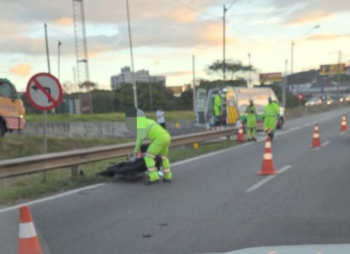 A ocorrência envolveu uma motocicleta que colidiu contra uma barreira. O condutor teve ferimentos leves e foi encaminhado ao Hospital Regional de São José.