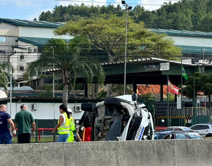 SJ Agora/Ricardo Pastrana Um acidente registrado na manhã desta quarta-feira (25), por volta das 9h50, mobilizou equipes de emergência no km 210 da BR-101, no sentido Sul, em São José, em frente à Intelbras. A ocorrência envolveu o capotamento de um veículo após uma colisão traseira.
