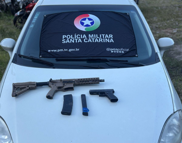Divulgação Na tarde desta terça-feira (12), o Núcleo de Inteligência de Segurança de São José (NUINT-SJ) deu apoio a uma operação do Batalhão de Operações Policiais Especiais (BOPE) que resultou na apreensão de um fuzil Colt calibre .556, uma pistola Glock 9mm, dezenas de munições e um galão de gasolina. A ação foi realizada após uma abordagem a um Fiat Linea com placas clonadas na Avenida Beira-Mar Norte, em Florianópolis.