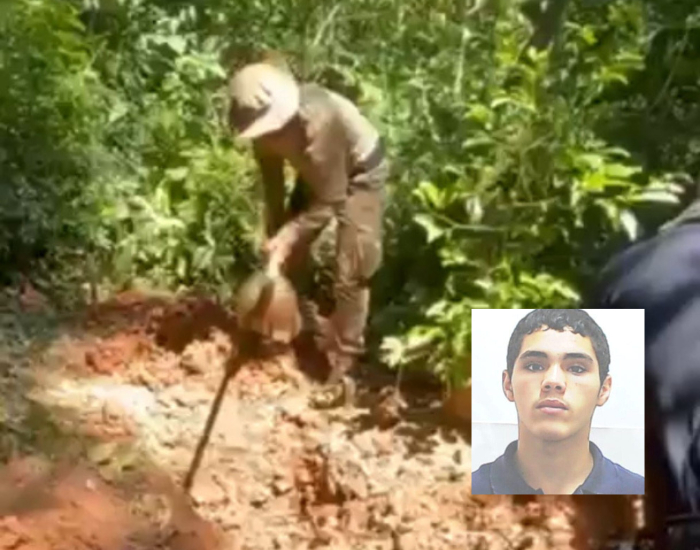 Vítima é um jovem de 25 anos; corpos foram localizados a cerca de 1,5 metro de profundidade após denúncia