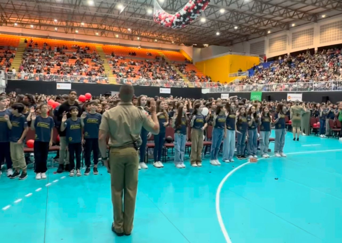 Reprodução/SJ Agora O Programa Educacional de Resistência às Drogas e à Violência (Proerd) formou, na noite desta quinta-feira (4), cerca de 1.150 alunos do 5º ano de 18 escolas municipais, estaduais e privadas de São José. A cerimônia aconteceu no Centro Multiuso, que ficou de casa cheia com familiares, amigos e professores prestigiando a ocasião.