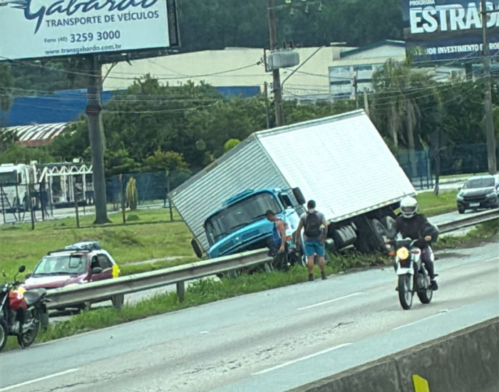 SJ Agora Quem passou pela BR-101 entre São José e Palhoça, no sentido Sul, enfrentou lentidão e encontrou interdição parcial após um caminhão sair da pista na manhã desta segunda-feira (16). A ocorrência foi registrada às 10h no km 212,1, na via marginal sentido Porto Alegre, mobilizando equipes da Autopista Litoral Sul.