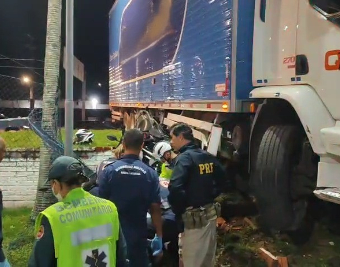 Segundo a PRF, o motorista perdeu o controle do caminhão, saiu da pista principal, invadiu a via marginal e atingiu o motociclista. A vítima, um jovem de 21 anos, foi arremessada ao chão. O caminhão só parou após invadir o pátio de uma empresa às margens da rodovia.